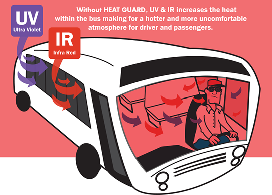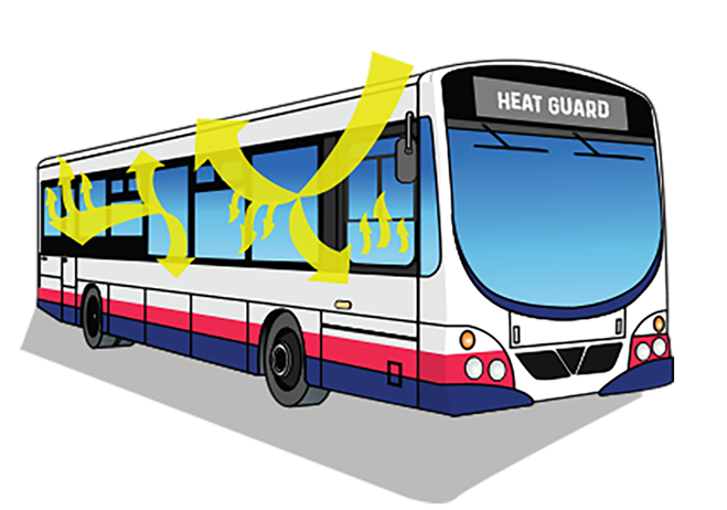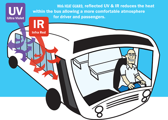 The “ORIGINAL” heat reflective glass for bus and rail vehicles. Heat Guard prevents heat and harmful UV rays from passing through the window and into the bus cabin. Heat Guard keeps the cabin cooler and more enjoyable for passengers and drivers.